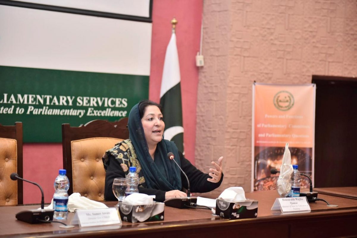 A major highlight of the workshop was the session on the Powers and Functions of Parliamentary Committees and the expectations of Members of Parliament from government officers appearing before committees. Honourable Wajeeha Qamar (MNA), Minister of State for Federal Education and Professional Training, described parliamentary committees as the heart of parliamentary oversight and stressed on the importance of thorough preparation, respectful engagement, and timely submission of information, noting that effective interaction with committees helps strengthen both policy outcomes and public trust.