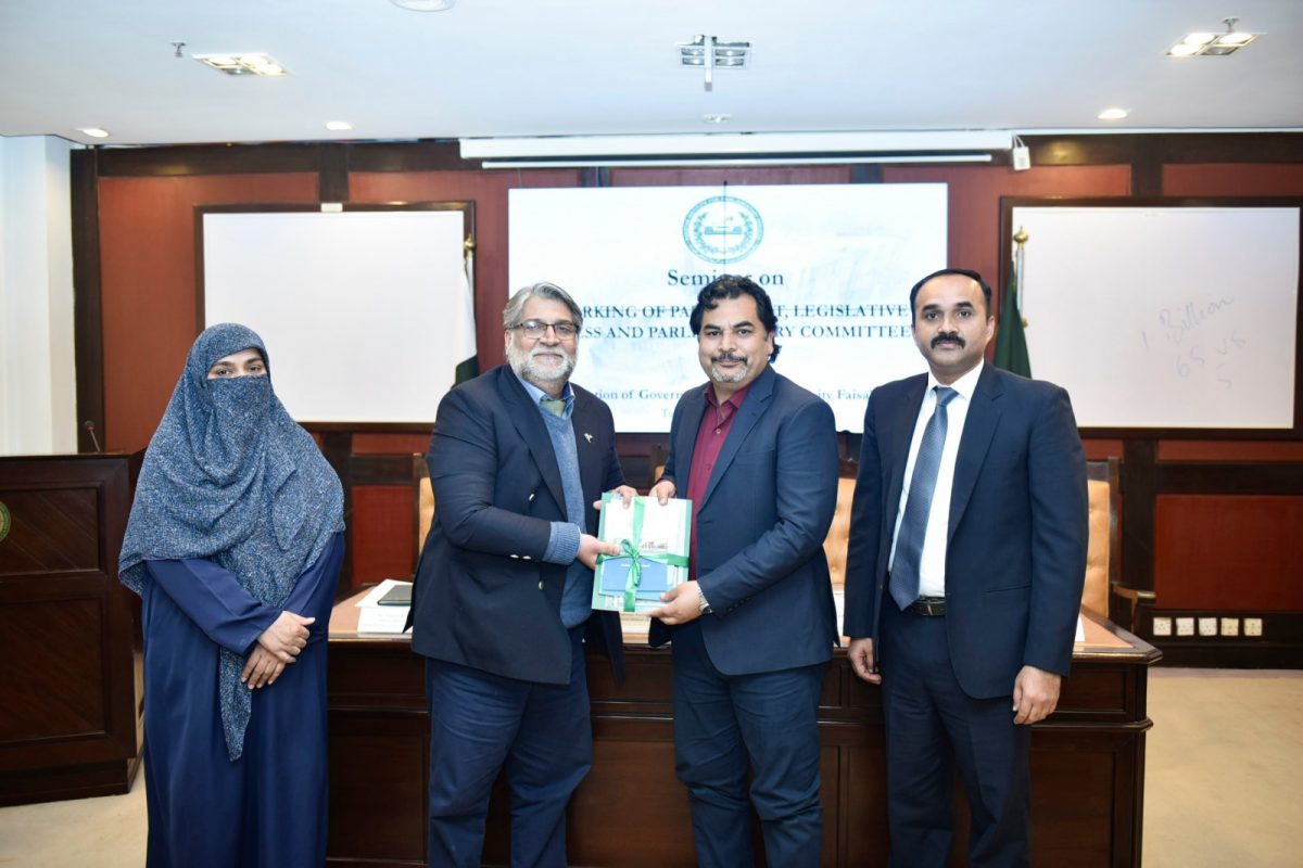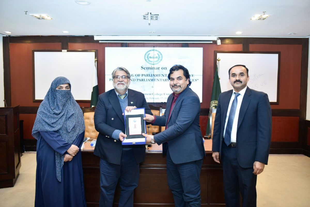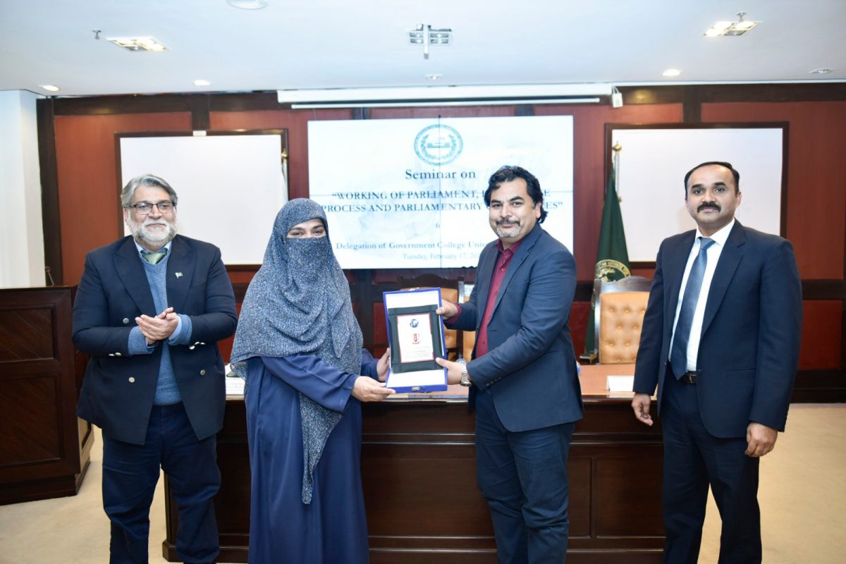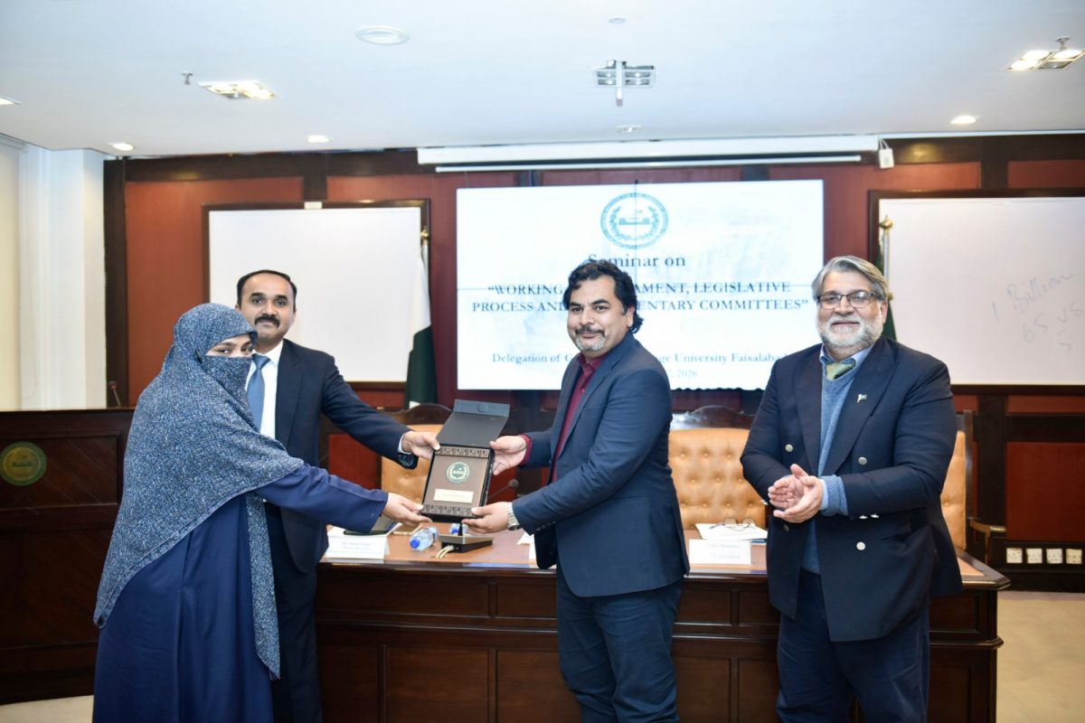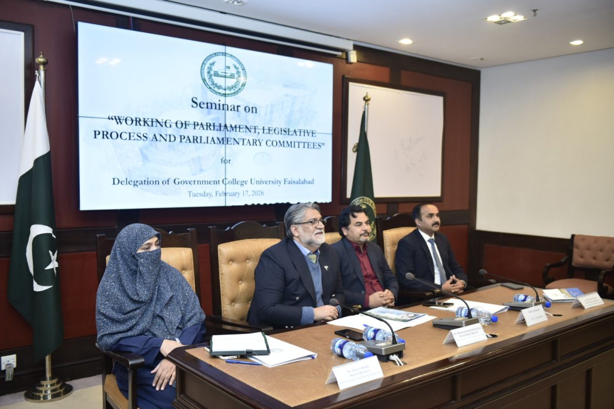 Pakistan Institute for Parliamentary Services (PIPS) organized a seminar on the “Working of the Parliament, legislative process and Parliamentary Committees” for students of Government College University Faisalabad on Tuesday, 17th February,2026 and a briefing session n with Hon Speaker AJK in Muzaffarabad on 18th Feb., 2026. A group of 34 faculty members and students including 10 PhD scholars from department of International Relations and Law, Government College University GCU Faisalabad attended the event. The sessions were part of Parliamentary Studies Initiative of the Parliament of Pakistan, and these seminars aimed to enhance students understanding of the salient features of the Constitution, the working of the Parliament, Committee effectiveness and legislative process. Mr. Wajid Aslam, Assistant Coordination Officer (Research) moderated this interactive session. The proceedings started with the National Anthem followed by recitation of verses from the Holy Quran by Qari Anis ur Rehman.