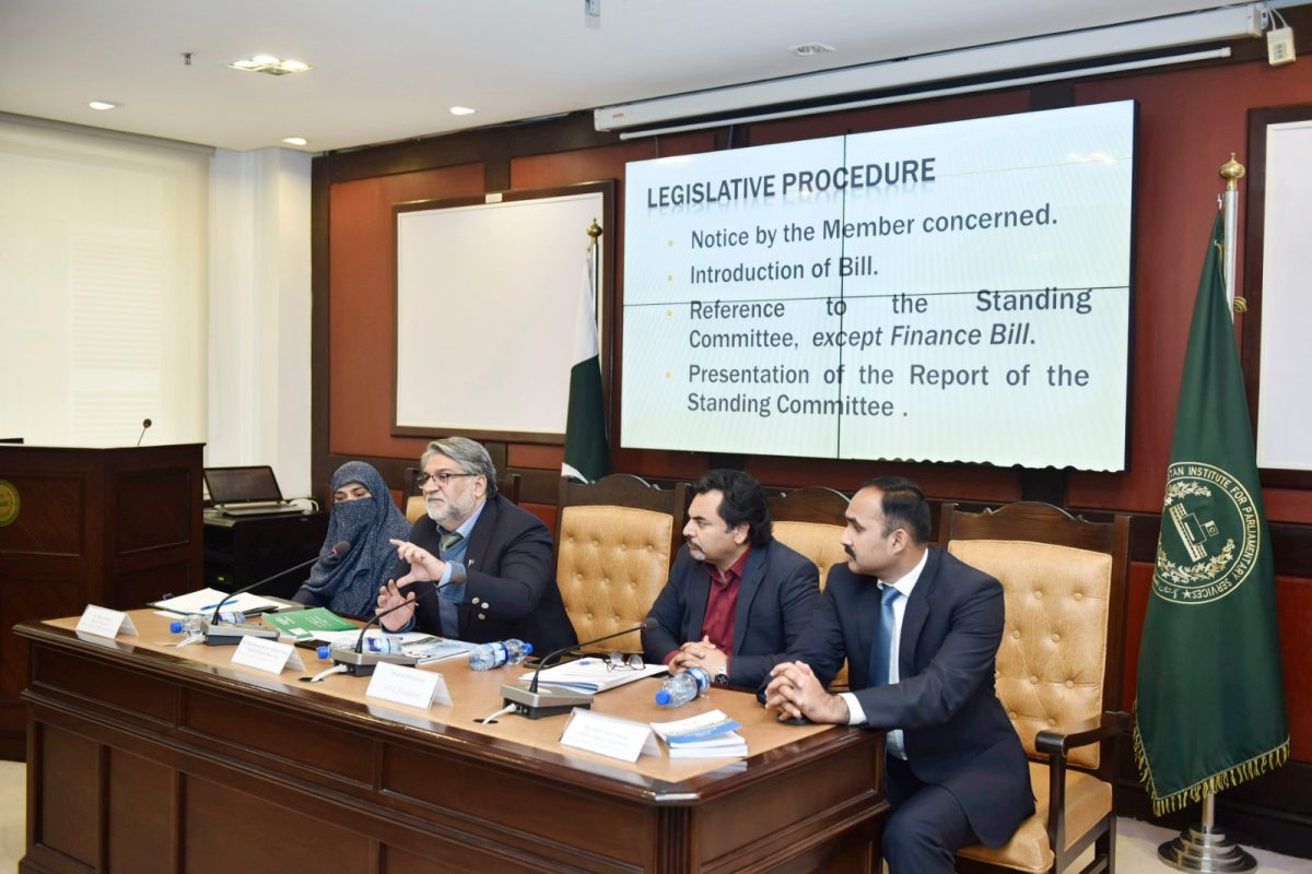 The 2nd session was on parliamentary Committees, which was conducted by Ms. Tehseen Khalid, Director (Research), PIPS. She explained the Committee system in detail; the composition, types, functions etc. She began her presentation with relevant constitutional provisions which establish the legal framework for the parliamentary committees in Pakistan. She highlighted the significance of the committee and discussed the rules of procedures pertaining to committees. She also delved upon various powers and duties of the committees. The final Session on Legislative and Non-Legislative Business was conducted by Mr. Abdul Nabi Solangi, Deputy Director (Legislation) PIPS. He briefed the participants about underlying principles of legislative process in Pakistan which include; Islamic code of life, separation of powers, parliamentary democracy, bicameral legislature and independence of judiciary. Mr. Solangi also shared different types of legislative instruments such as bills, acts and ordinances.