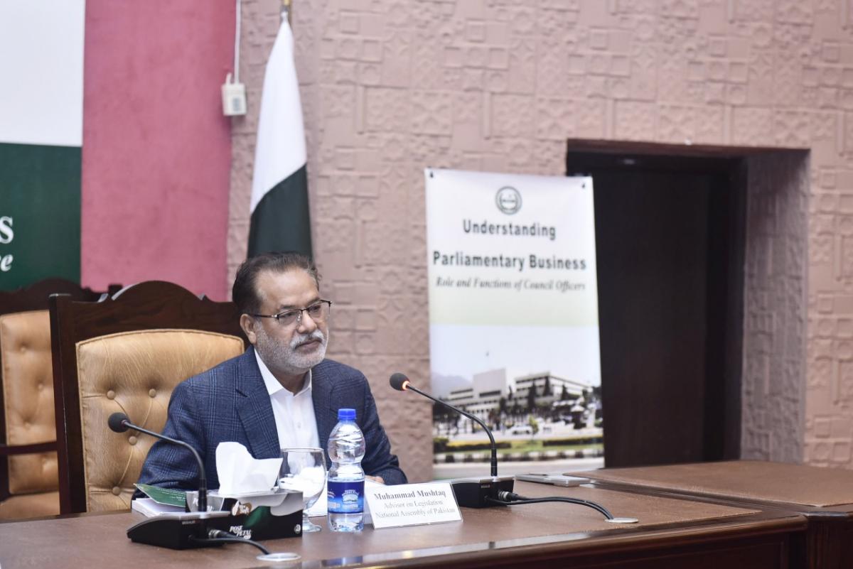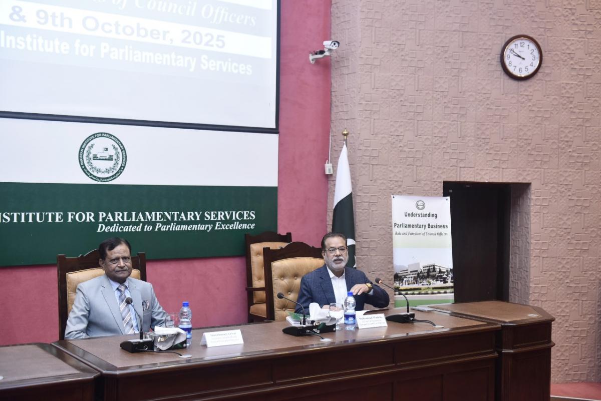 The first technical session was delivered by Mr. Sheikh Sarfaraz Ahmed, Legislative Advisor, Ministry of Railways, on “The Constitution: Understanding the Relationship between Parliament and the Federal Government.” He discussed constitutional provisions governing legislative–executive relations, separation of powers, and the legislative and non-legislative business of Parliament. Addressing participants’ queries, he elaborated on challenges faced by council officers, including time constraints in responding to parliamentary questions, and explained procedures for managing misdirected queries. Mr. Sarfaraz also discussed the process for Private Members’ Bills, Rule 31 of the Rules of Business, 1973, the President’s assent and ordinance-making powers, ministerial accountability under Article 90, and the jurisdiction of Standing Committees. Participants actively contributed with questions and comments. The second session, conducted by Mr. Muhammad Azam Sulahri, Deputy Secretary, Senate Secretariat, focused on “Responsibilities of Council Officers.” It provided practical insights into strengthening coordination between ministries and parliamentary committees. The day concluded with a session by Mr. Muhammad Anwar, Secretary (Retd.), Senate Secretariat, and former Executive Director, PIPS, on “Rules, Provisions, and Responsibilities of Council Officers in Non-Legislative Business.” He elaborated on parliamentary rules and procedures, emphasizing the preparation and handling of parliamentary questions, role of council officers in handling Parliamentary Questions, coordination with stakeholders within their Ministry and Parliamentary Secretariat, and maintenance of accuracy and timeliness in responses. His insights, drawn from years of parliamentary experience, provided valuable guidance for participants in their official roles.