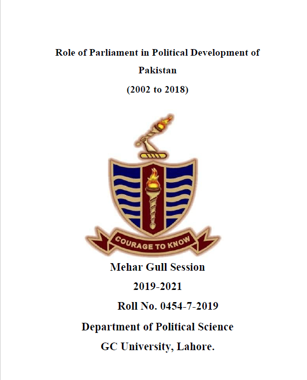 It has been seen that Pakistan’s political system doesn’t remain consistent in stabilizing its political institutions like parliament. Authoritarian tendencies, interference of departments, military interventions, centralization of the state, imbalance in civil-military relations, instability of political parties have always effect the stability and political development in Pakistan. In this context, Parliament is not considered as a mature institution to show continuous political development in the state. Parliament is the institution representing the society and public. If representative institutions are weak then other institutions will dominate weakening the political system and under such state of affairs political development also suffers. For the research thesis, the timeframe of 2002- 2018 is supposed to be the main functionary of the study. The research study was aimed to investigate the role of parliament in the political development of Pakistan with the analysis of other factors and challenges. The strengths, weaknesses, opportunities, and performance of the parliament will be discussed in the study and their influence in changing the nature of the political development of Pakistan.